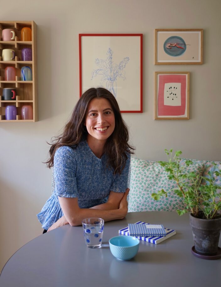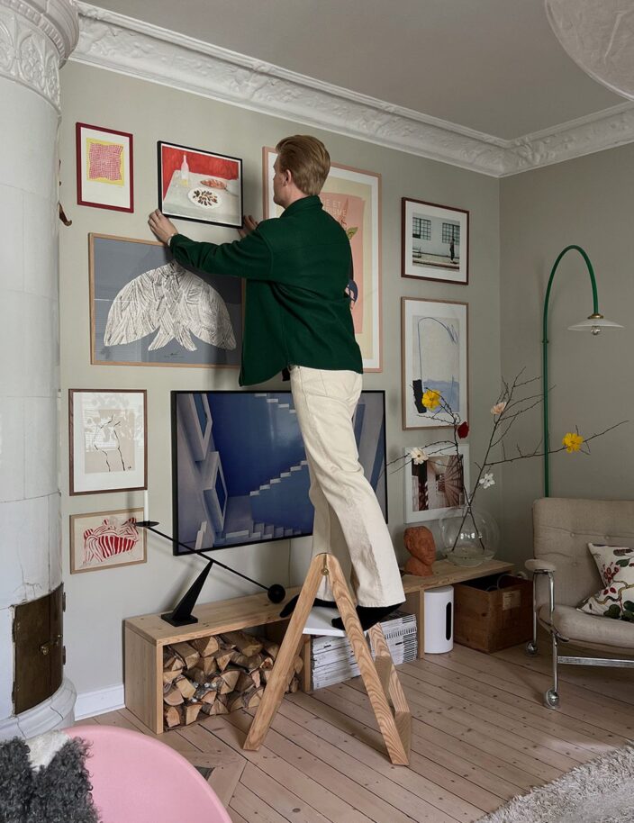 The interior and colour guru, Sofie Amalie Rolandsen, intentionally mixes different styles of art prints while keeping the colour scheme to reds and blues to create cohesion in her kitchen nook