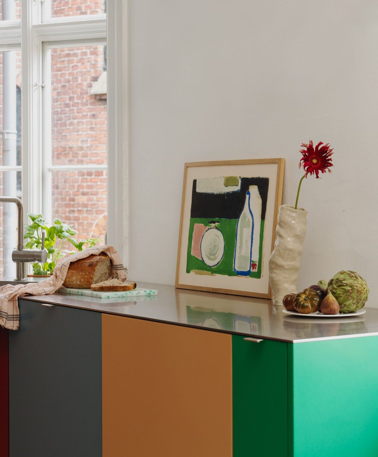 Motifs that celebrate the art of cooking, dining and togetherness offer a mood-enhancing feast for the eyes. Neutral appliances provide a canvas for bursts of colour, making framed art prints an ideal way to infuse the space with character, on either a wall or shelf. Smaller prints fit seamlessly into tight spaces, while vibrant poster prints or coloured art frames add glimpses of joy.