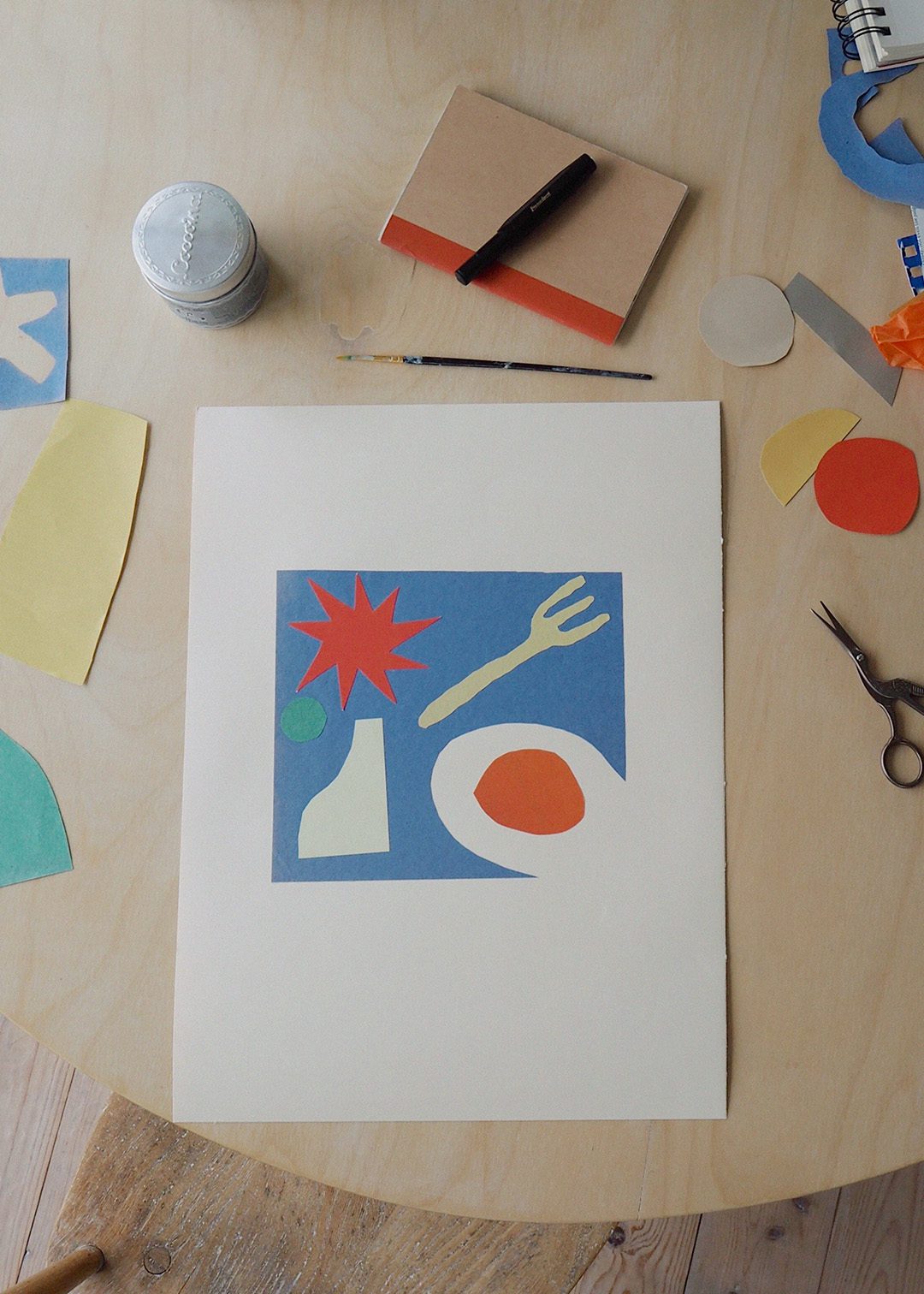 The grounding sensation the countryside has on Ellie is allowed to shine through her work and creative process as well. Sometimes she will sit in cafés sketching, but most of the time she works from home. Enjoying the option to have a slow morning with plenty of coffee, a newspaper to be read that she will then sift through to look for pieces of colours to cut out and use as material.