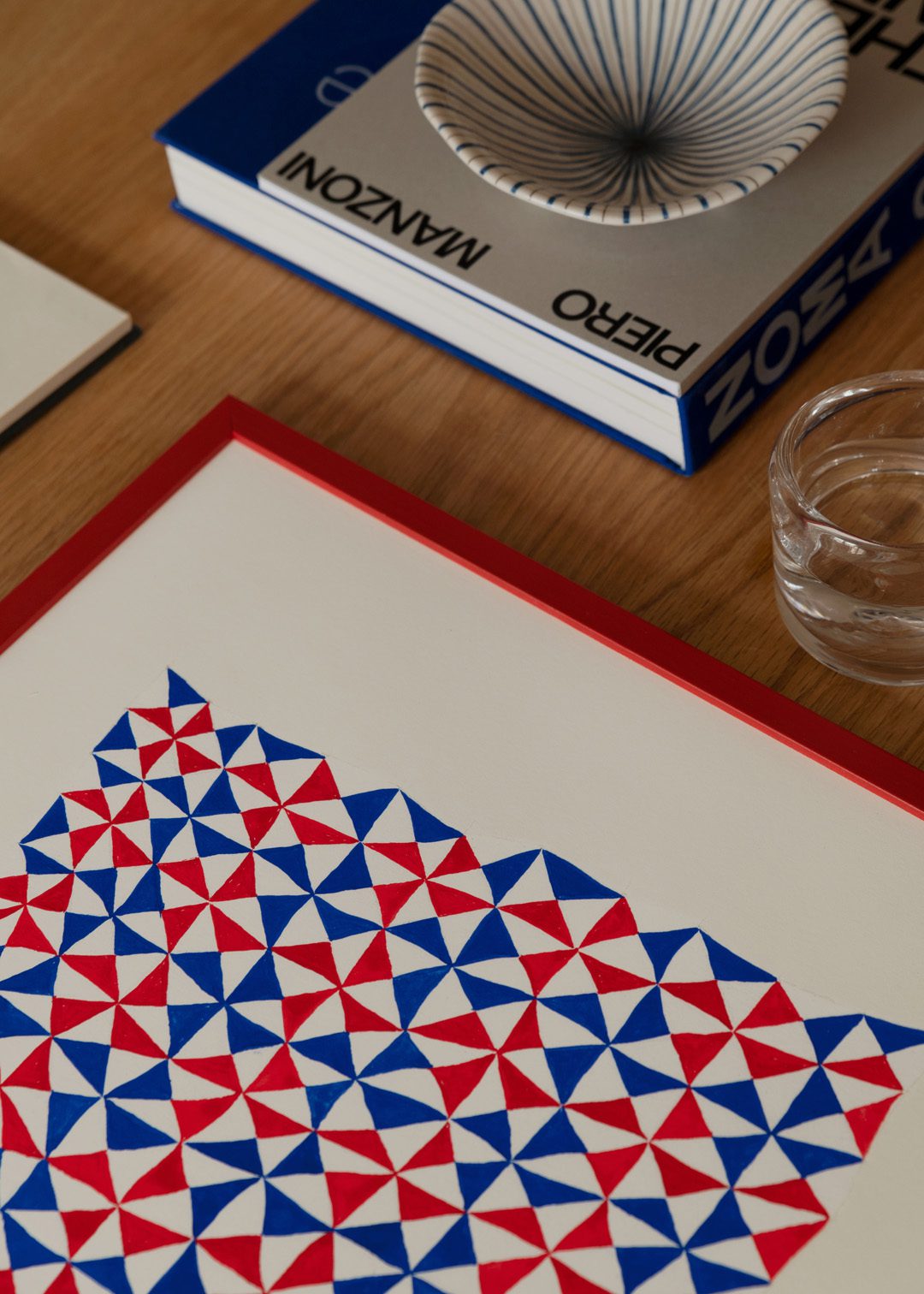 While she studied at the Royal College of Art in London, Kyhl also trained as a decorator and painter, restoring historic buildings. It required using old techniques such as marbling, woodgraining and guilding. A knowledge that still lies at the heart of Kyhl’s work today: Although her colour palette is bright and light-hearted, her mosaic motifs seem to lend inspiration from the marbled floors of historic architecture.
