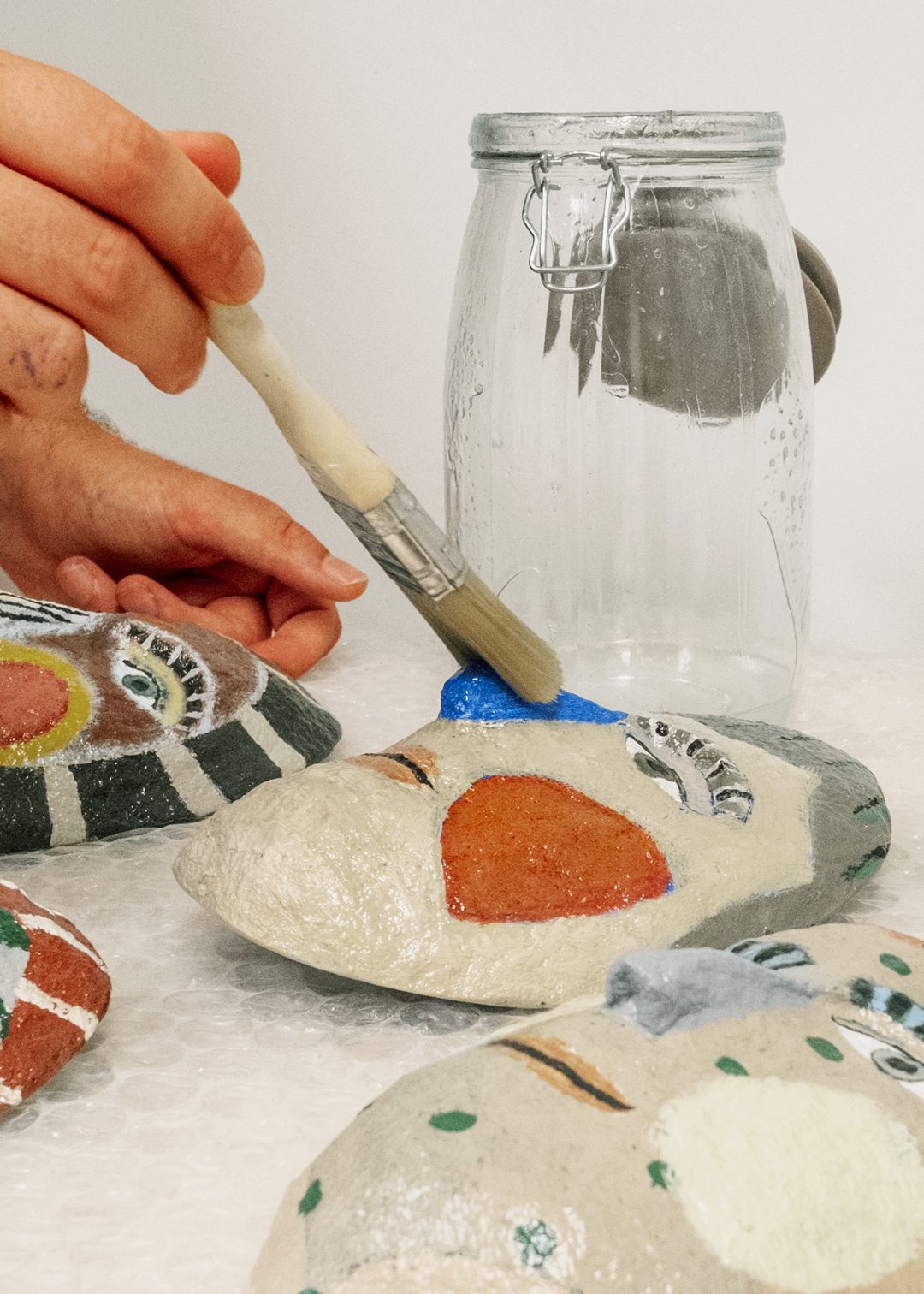 Their masks are primarily made of papier-mâché, but they experiment with various materials, including clay and fabric, to find the best fit for each project. For their series of art prints for The Poster Club, they used strips of coloured paper. “We wanted the posters to be a more abstract translation of the masks, so we ended up using a collage technique which has a similar approach to the layers in our masks,” they explain. Their method of painting the masks is highly intuitive: “Each mask has an underpainting by one of us and the other one completes it. Sometimes it takes many layers before we decide it’s finished.”