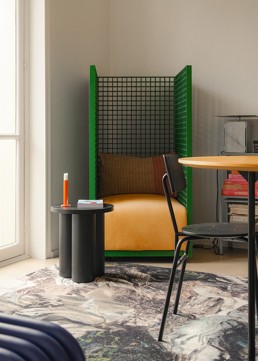 At the heart of his home sits a statement piece—a bold, bright yellow coffee table from B-Line. It’s not just furniture; it’s a conversation starter, embodying Amaël’s knack for injecting life into spaces.