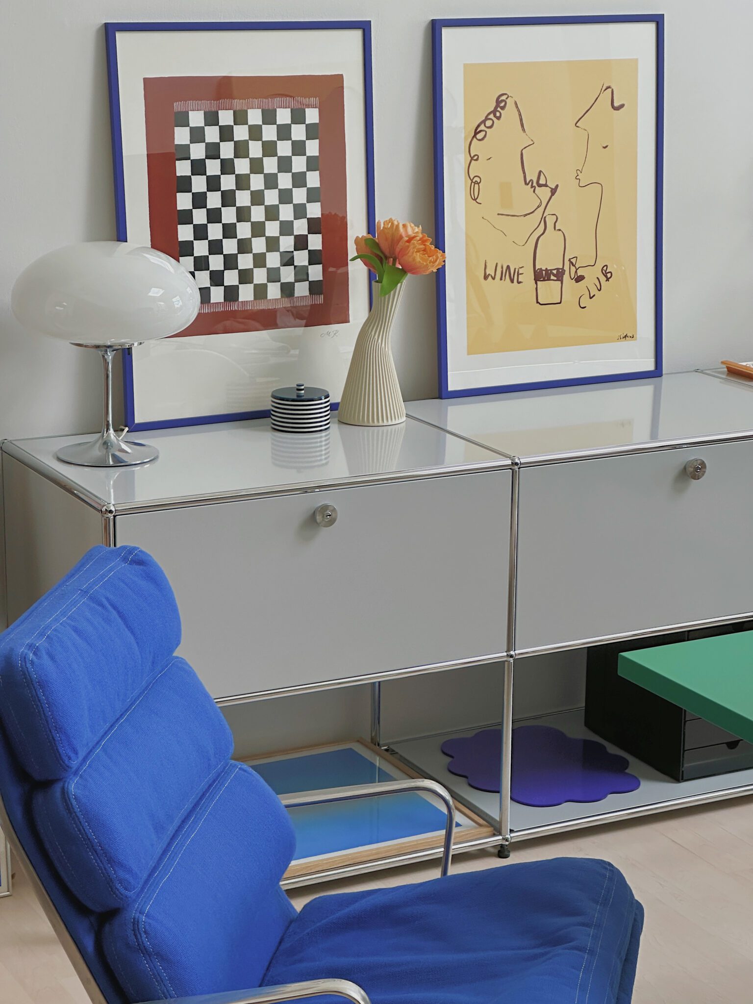 Especially the skewered checker pattern and interesting colour combination in the two prints by Mille Henriksen caught Wang’s attention as it matches some of the furniture they already own.