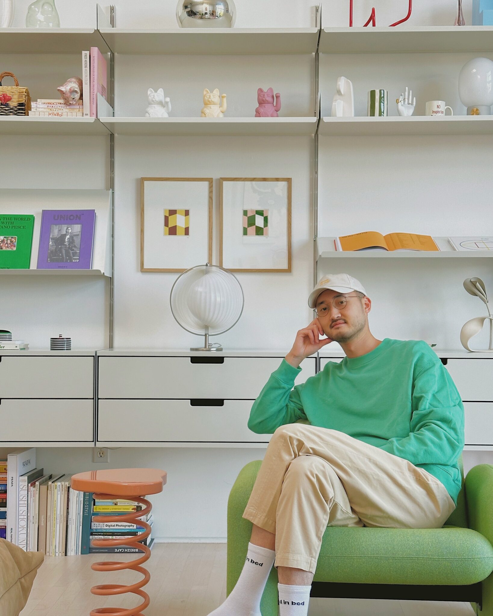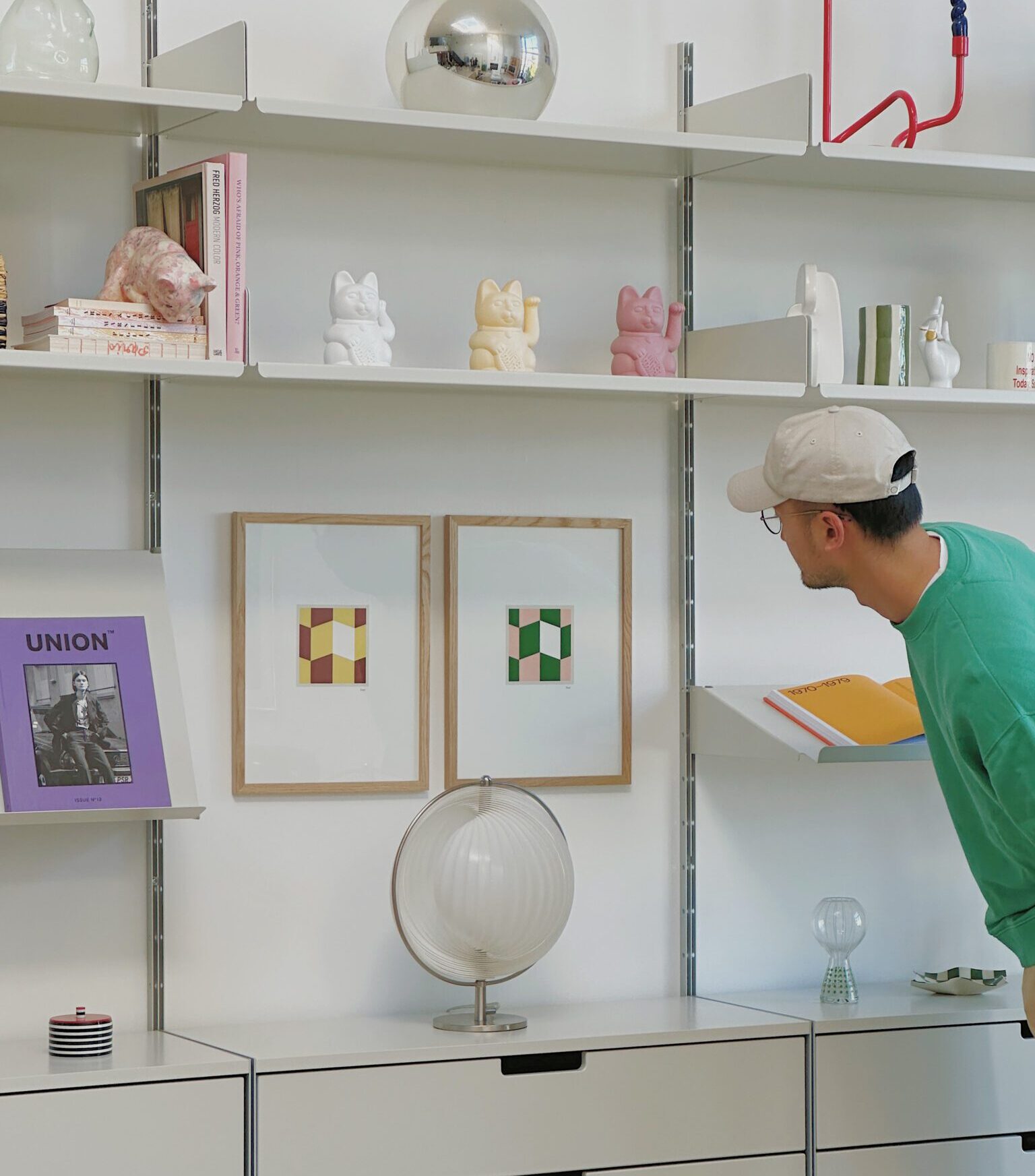 The same consideration has gone into his curation of art. The prints Wang has selected are chosen based on their colour scheme and the variety of geometric and organic shapes.