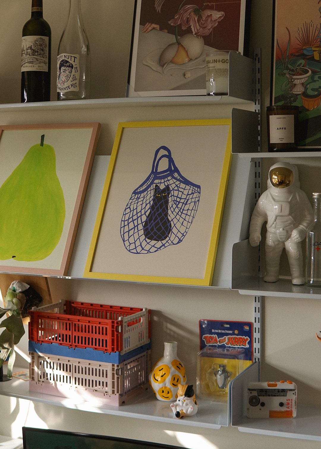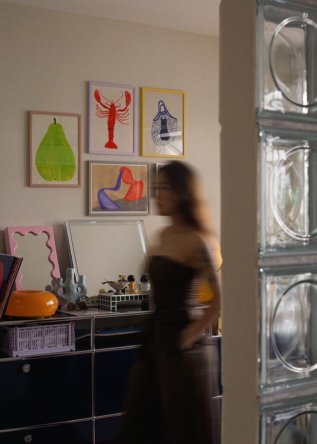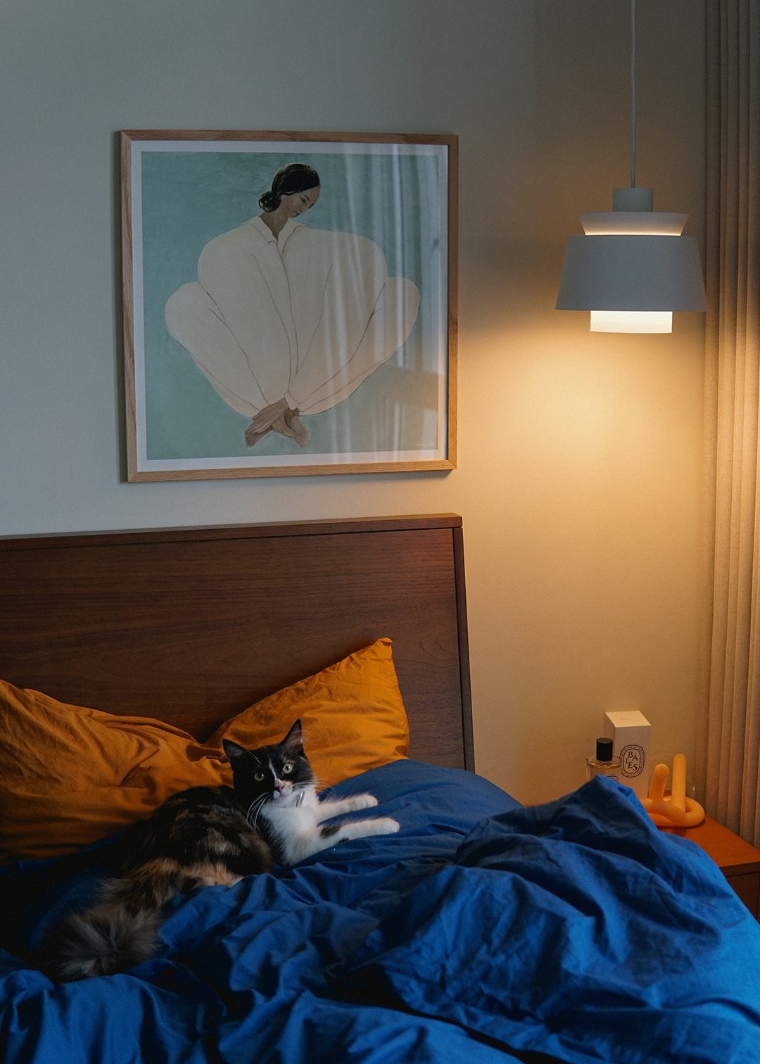One piece that holds particular significance for them is “Meet Me at Jaurès” by Sofia Lind. “This piece is special to us,” Edith says. Placed as a focal point in their bedroom, its light and airy colour palette creates a calming atmosphere.