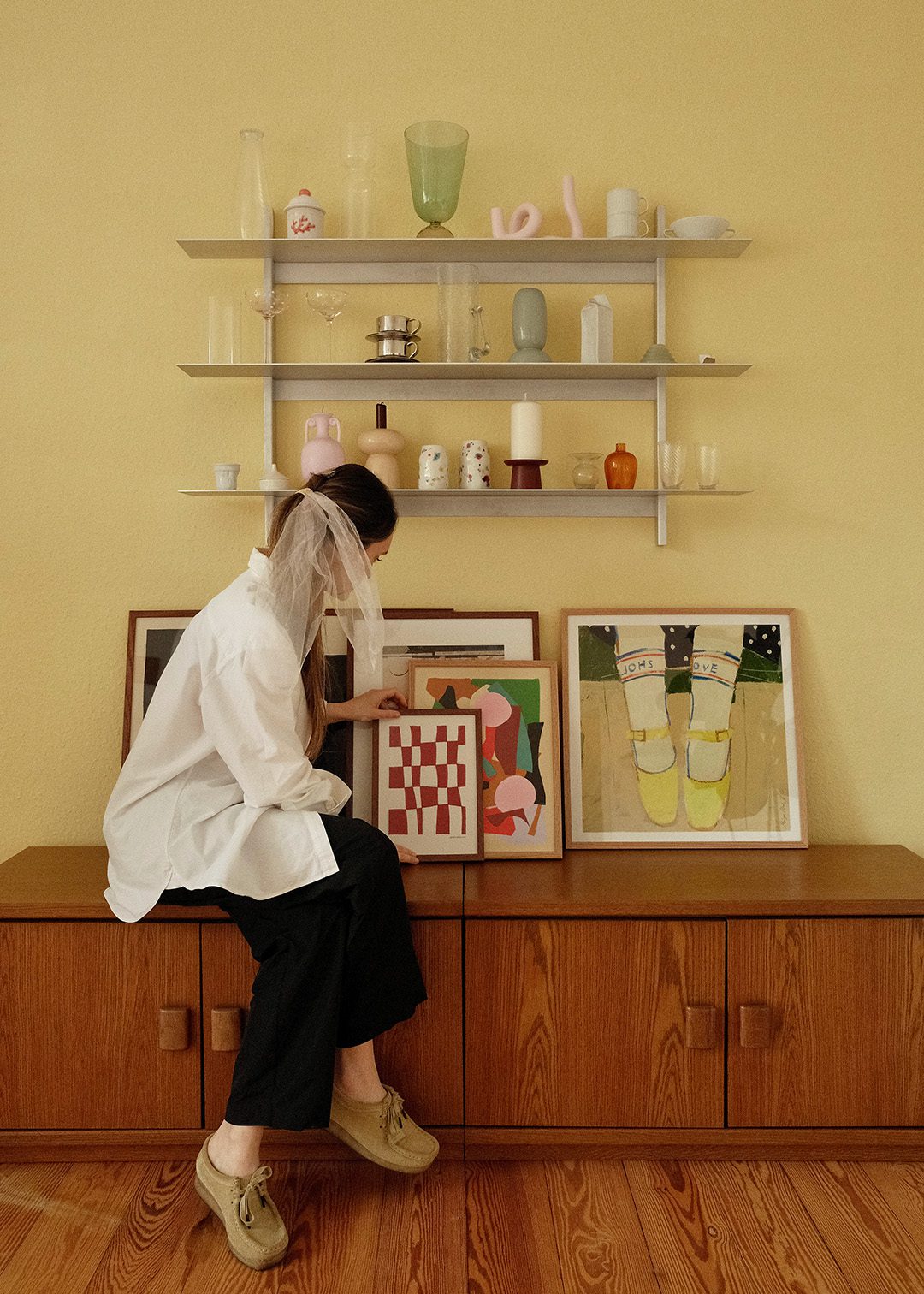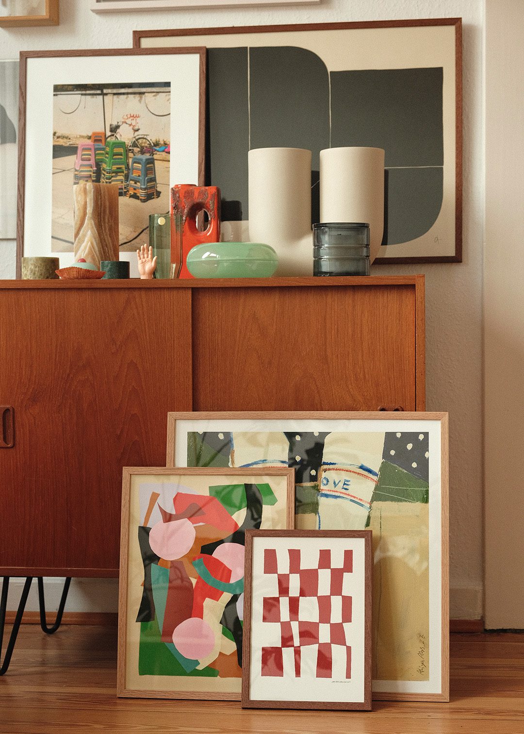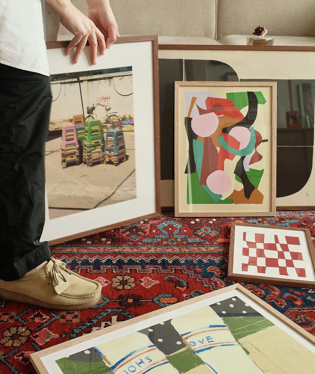 The prints curated by Amna reflect the essence of her apartment – timeless and classic as a base, adorned with playful and colourful prints. It’s a deliberate mix of media, seamlessly combining photography and painting to craft an eclectic composition on the gallery wall.