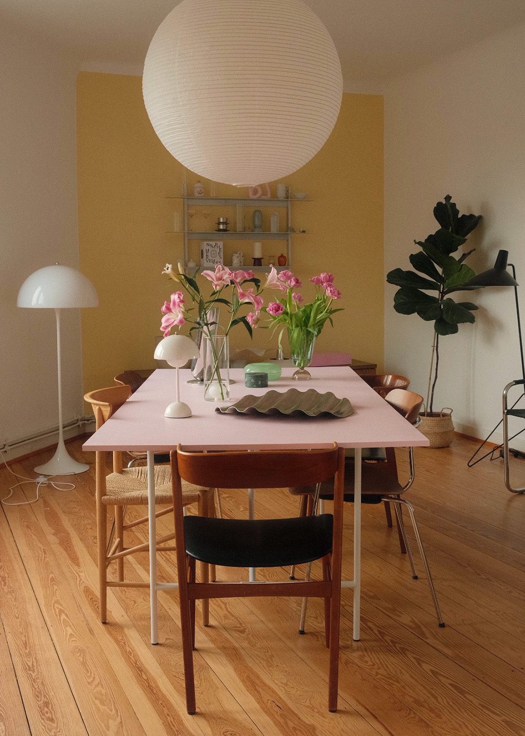 Her interior style is an exquisite blend of midcentury furniture mixed with design classics and a playful palette of pastel hues. Amna revels in the synergy of heavy wooden furniture and light pastels. “It makes it more fun and playful,” she notes, pointing to the dining room where a light pink table harmonizes with midcentury chairs.