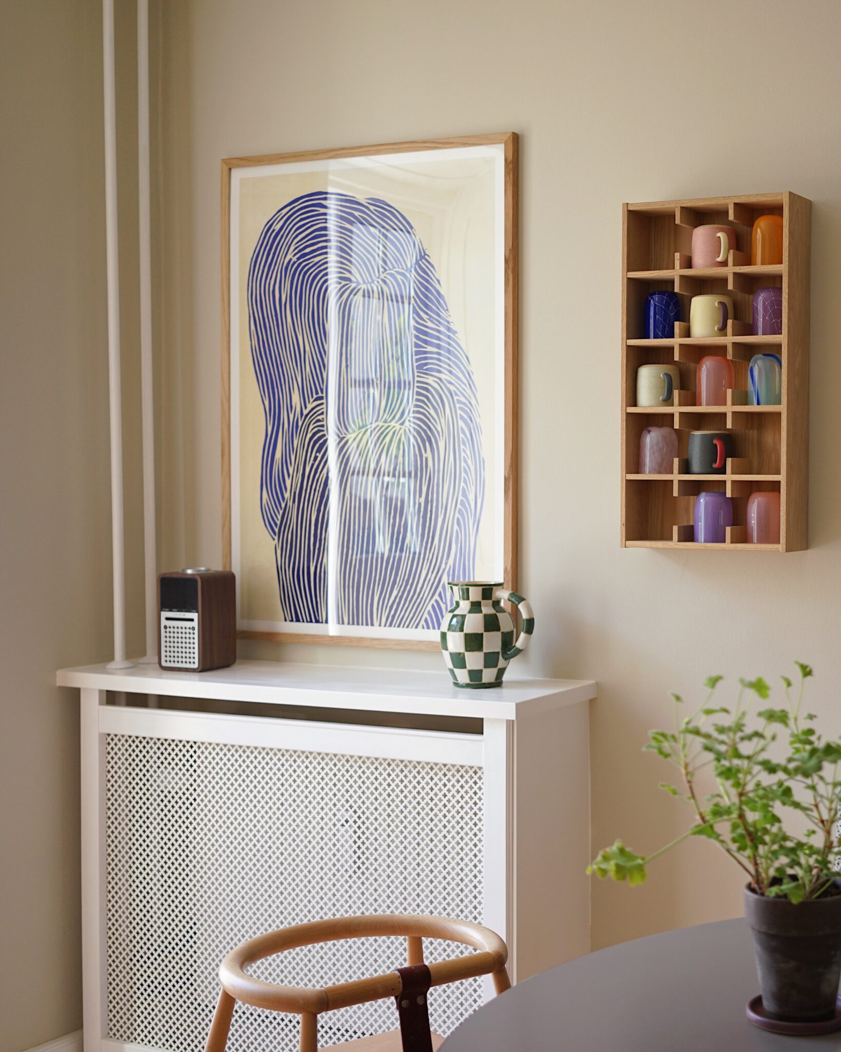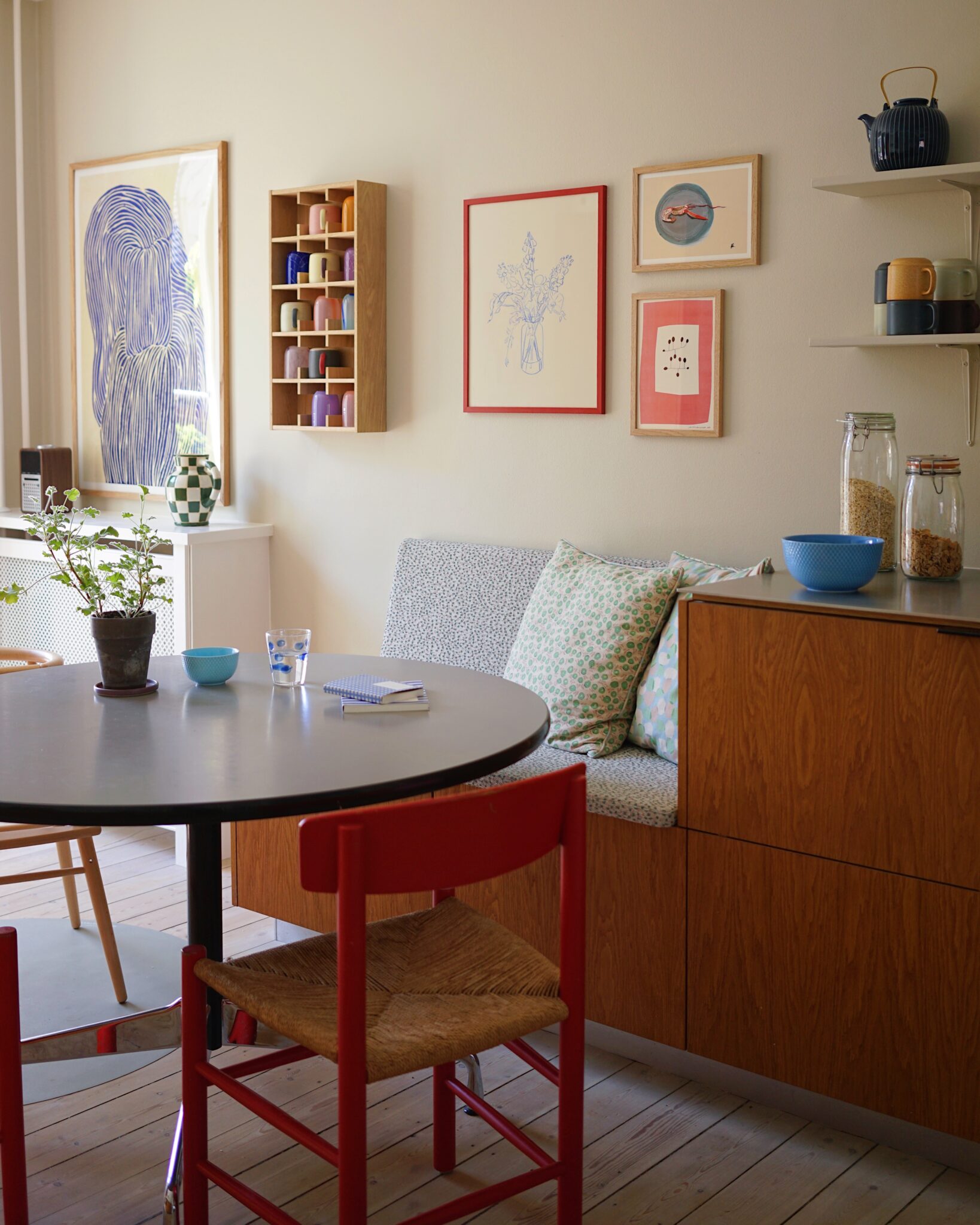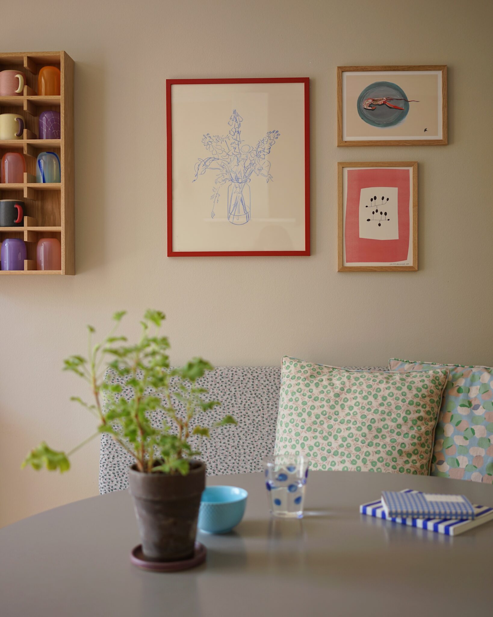 “To me, art is similar to your outfit’s accessories: These finishing notes that set the ambience and tie it all together.” And that is exactly what Sofie Amalie Rolandsen wanted for her small kitchen nook. Intentionally mixing different styles of art prints but keeping the colour scheme to reds and blues.