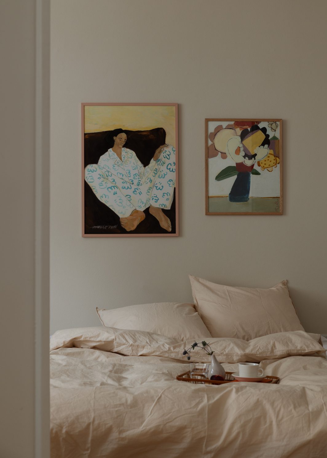 Elevate your bedroom space with this perfect pair, featuring art prints where tranquil scenes and abstract florals converge, curating a restful escape within a serene tableau that pairs life’s stillness with the soft whisper of nature’s touch.